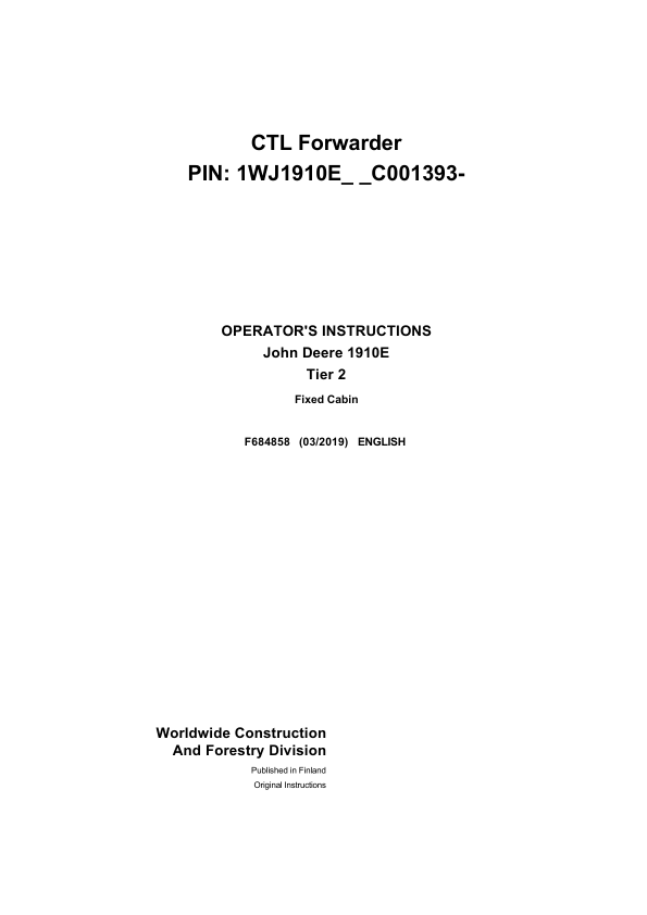 John Deere 1910E T2 FFC Forwarders Operator’s Manuals (F684858)