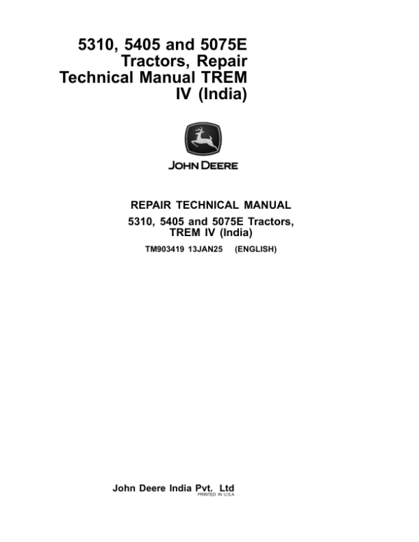 John Deere 5310, 5405, 5075E (TREM IV) Tractors Repair Technical Manual (India – Built from 2021)