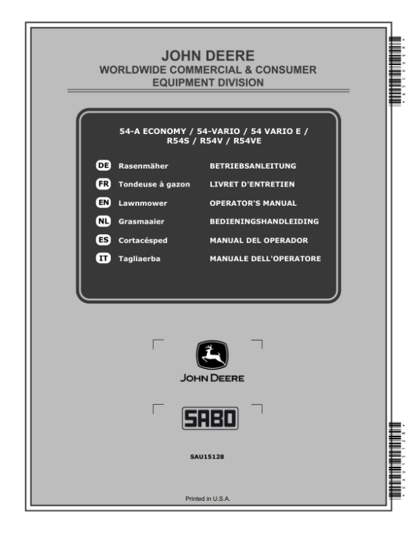 Be the first to review “John Deere 54-A ECONOMY, 54-VARIO, 54 VARIO E, R54S, R54V, R54VE Lawn Mowers Operator’s Manual (SAU15128)”