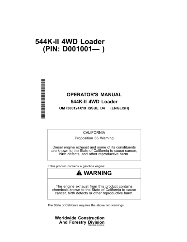 John Deere 544K SERIES II Loaders Operator’s Manuals (OMT386124X19)