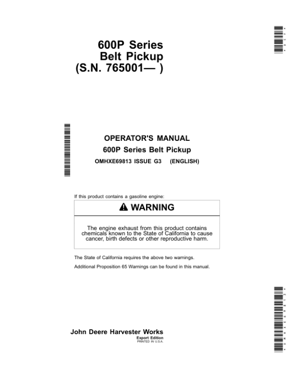 John Deere 600P Series (615P) Belt Pickup (765001-) Operator’s Manual (OMHXE69813)