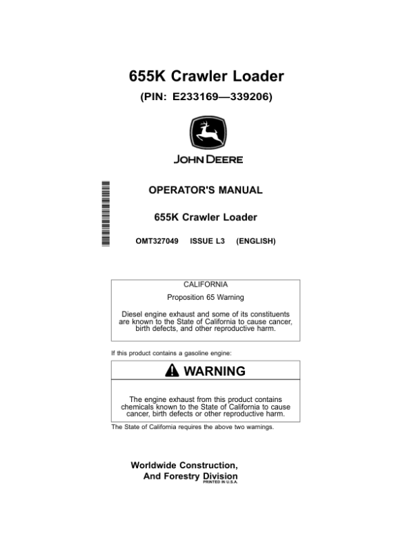 John Deere 655K Crawler Loaders Operator’s Manuals (OMT327049)