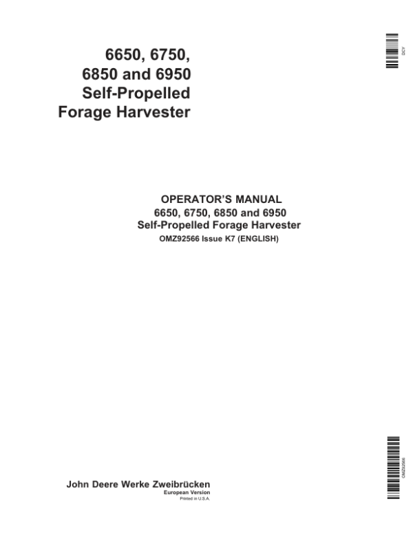 John Deere 6650, 6750, 6850 & 6950 Self Propelled Forage Harvesters Operator’s Manual (OMZ92566)