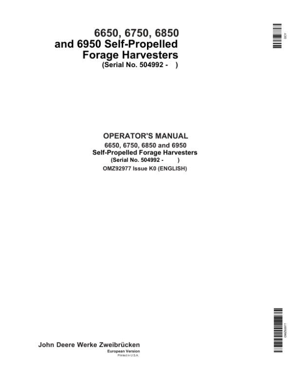 John Deere 6650, 6750, 6850 & 6950 Self Propelled Forage Harvesters Operator’s Manual (OMZ92977)