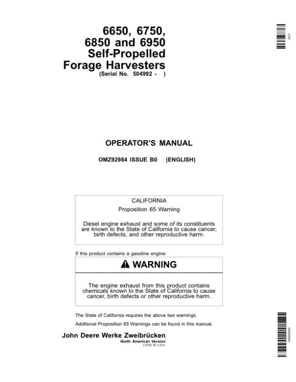 John Deere 6650, 6750, 6850 & 6950 Self Propelled Forage Harvesters Operator’s Manual (OMZ92984)