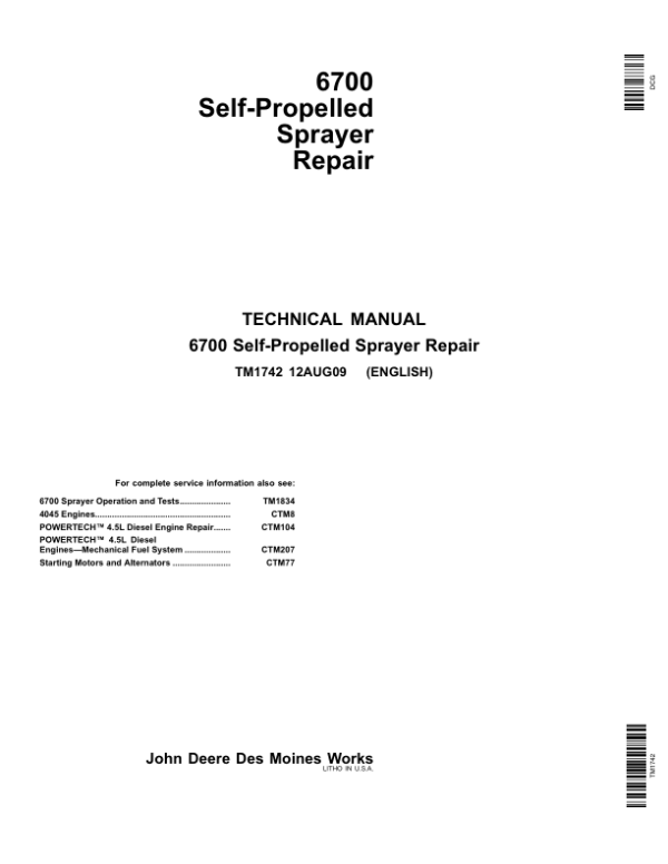 John Deere 6700 Self-Propelled Sprayer Service Repair Manual (TM1742 & TM1834)