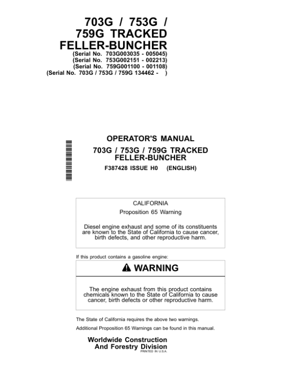 John Deere 703G, 753G, 759G Tracked Feller Bunchers Operator’s Manuals (F387428)