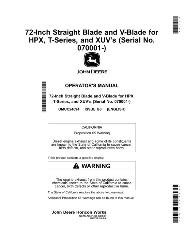 John Deere 72-Inch Straight Blade, V-Blade for HPX, T-Series, XUV’s (070001-) Operator’s Manual (OMUC24694)