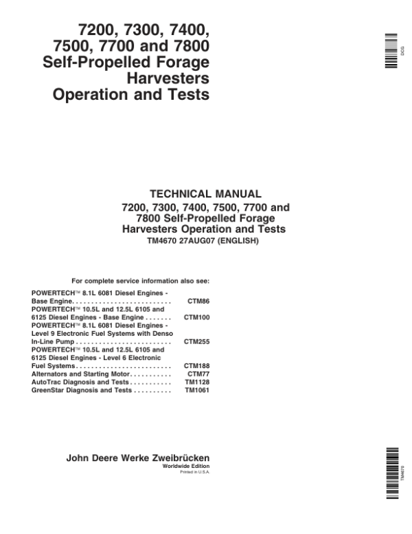 John Deere 7200, 7300, 7400, 7500, 7700, 7800 Harvester Repair Technical Manual (TM4670 & TM4668)