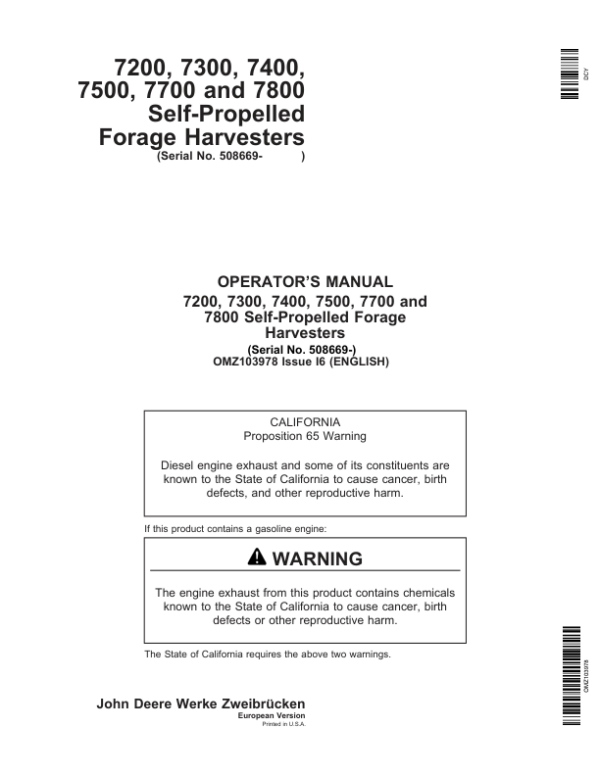John Deere 7200, 7300, 7400, 7500, 7700 & 7800 Self-Propelled Forage Harvesters Operator’s Manual (OMZ103978)