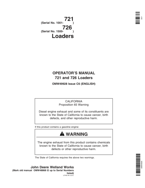 John Deere 721 & 726 Loaders Operator’s Manual (OMW49928)