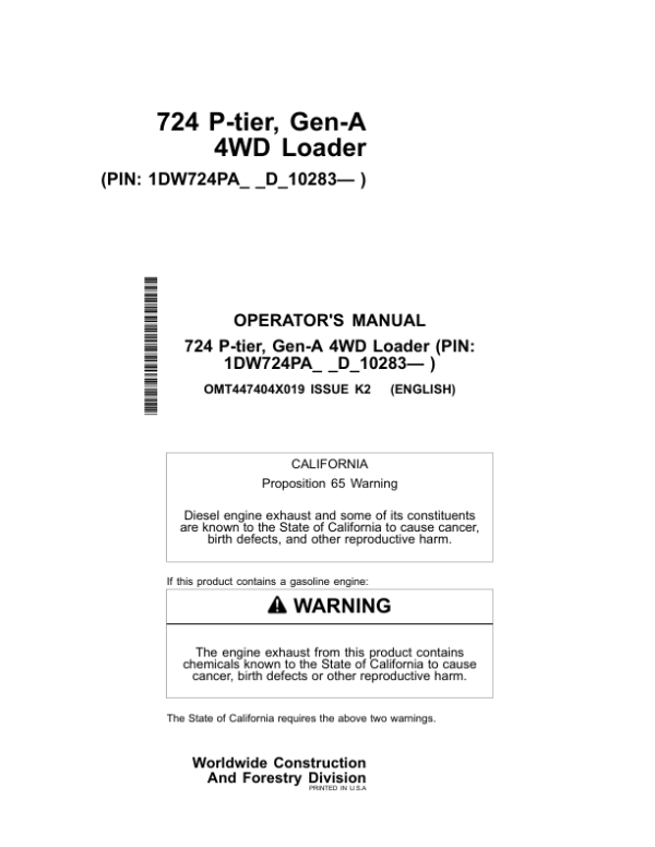 John Deere 724 P Loaders Operator’s Manuals (OMT447404X019)