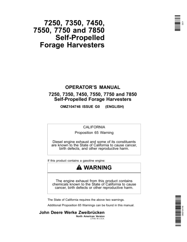 John Deere 7250, 7350, 7450, 7550, 7750 & 7850 Self- Propelled Forage Harvesters Operator’s Manual (OMZ104746)