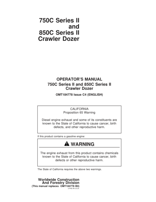 John Deere 750CII, 850CII Crawlers Operator’s Manuals (OMT184778)
