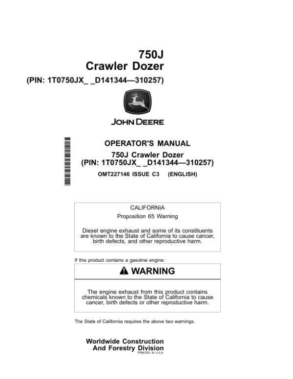 John Deere 750J Crawler Dozers Operator’s Manuals (OMT227146)