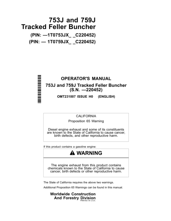 John Deere 753J, 759J Tracked Feller Bunchers Operator’s Manuals (OMT231007)