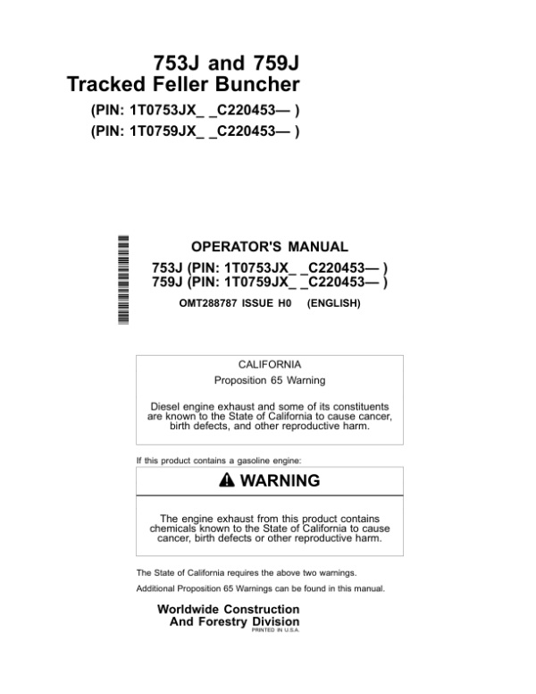 John Deere 753J, 759J Tracked Feller Bunchers Operator’s Manuals (OMT288787)