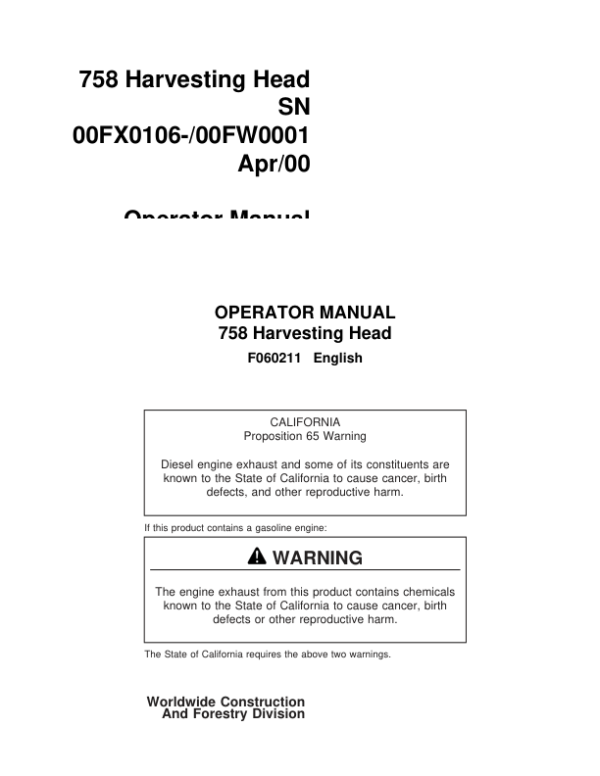John Deere 758, 758HD Harvesting Heads Operator’s Manuals (F060211)