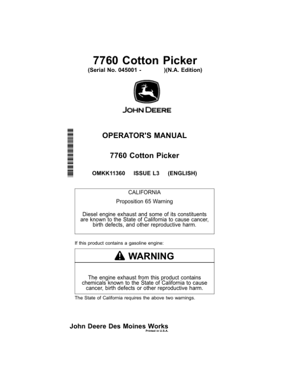John Deere 7760 Cotton Picker (450001-) Operator’s Manual (OMKK11360)