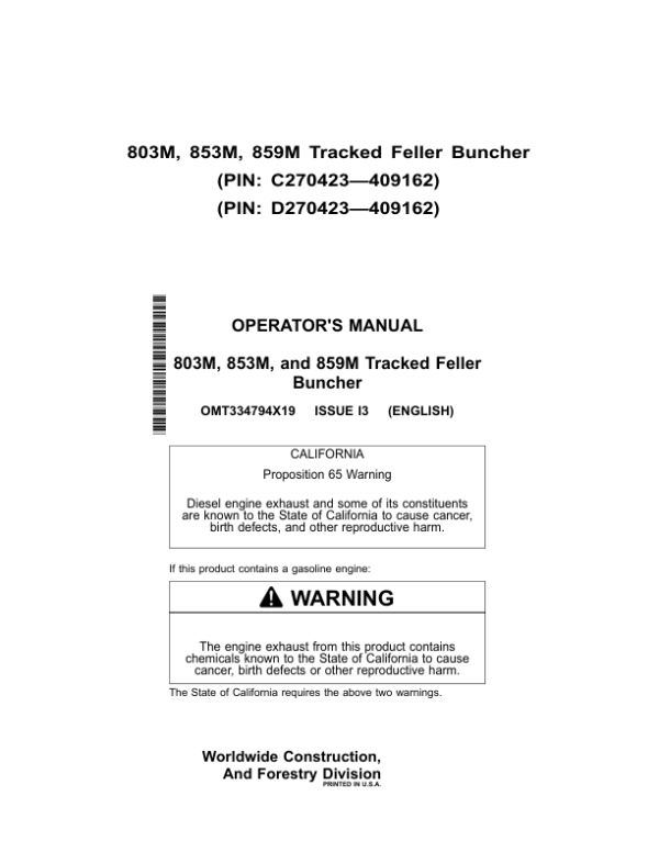 John Deere 803M, 853M, 859M Tracked Feller Bunchers Operator’s Manuals (OMT334794X19)