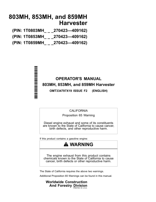 John Deere 803MH, 853MH, 859MH Tracked Harvesters Operator’s Manuals (OMT334797X19)