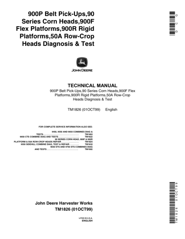 Be the first to review “John Deere 900P Belt Pick-Ups, 90 Series Corn Heads, 900F Flex Platforms, 900R Rigid Platforms, 50A Row-Crop Heads Repair Manual”
