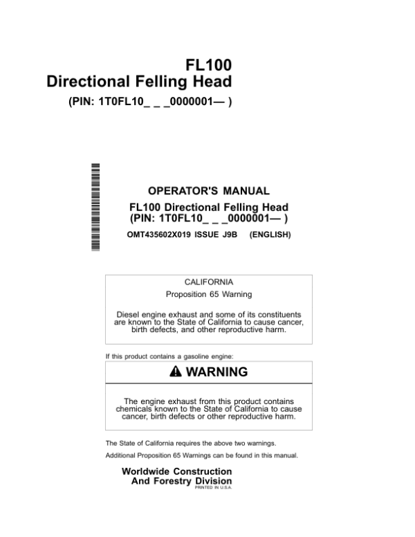 John Deere FL100 Felling Heads Operator’s Manuals (OMT435602X019)