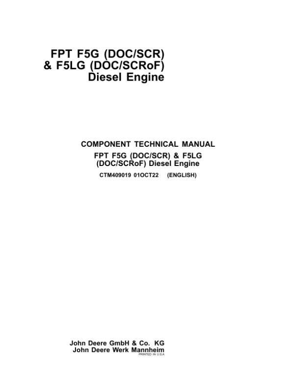 John Deere FPT F5G (DOCSCR) & F5LG (DOCSCRoF) Diesel Engine Component Technical Manual (CTM409019)
