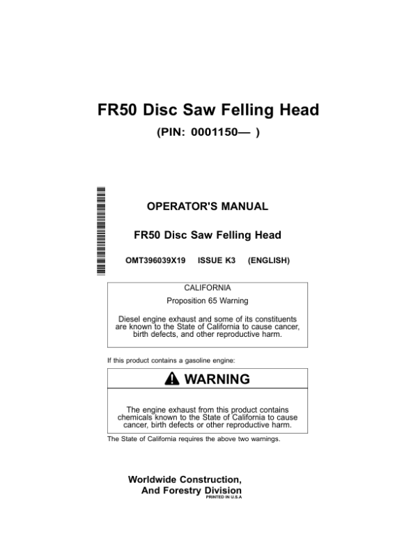 John Deere FR50 Stt Disc Saw Felling Heads Operator’s Manuals (OMT396039X19)