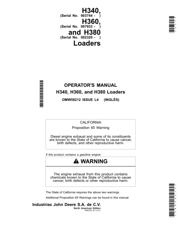 John Deere H340 Loaders (003744- ) H360 Loaders (007933- ) H380 Loaders (002320- ) North America Operator’s Manual (OMW58212)
