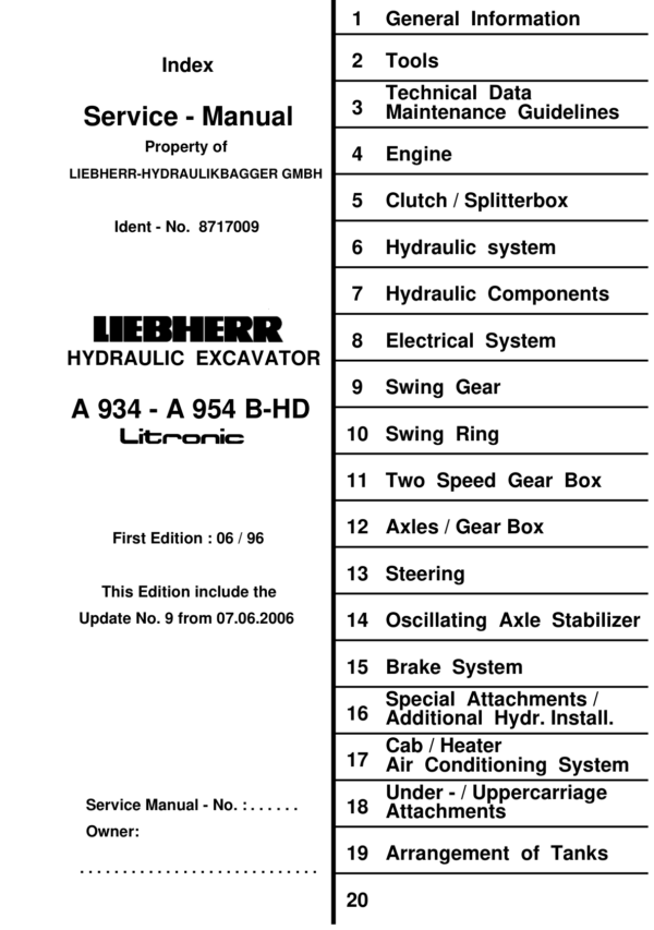 Table of Content – Liebherr A934, A934 HD Litronic Excavator Type 712 & 713 Manual
