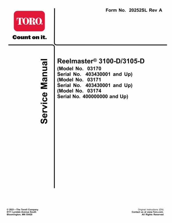 Be the first to review “Toro Reelmaster 3100-D, 3105-D (SN 403430001 and Up) Service Repair Manual”